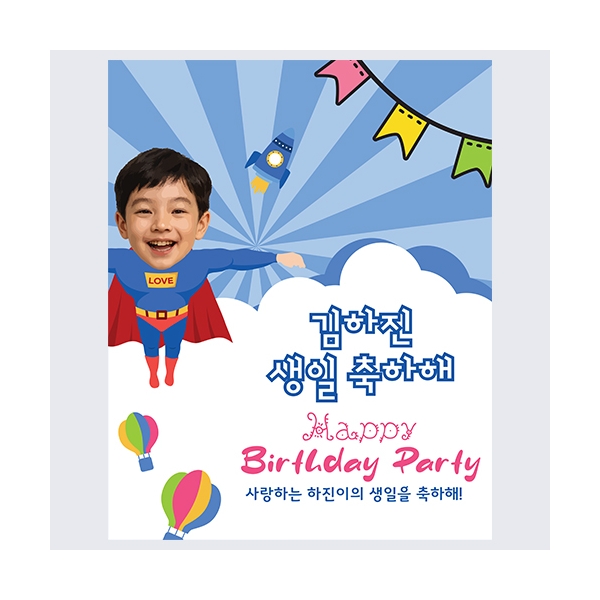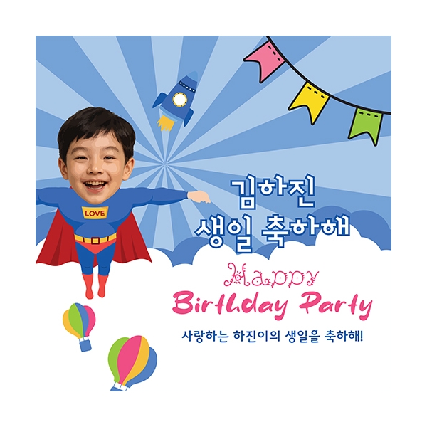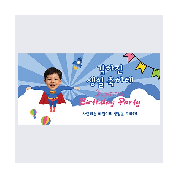 구름을 뚫고 하늘로 날아가는 슈퍼 히어로를 얼굴과 합성한 생일축하 이벤트 현수막